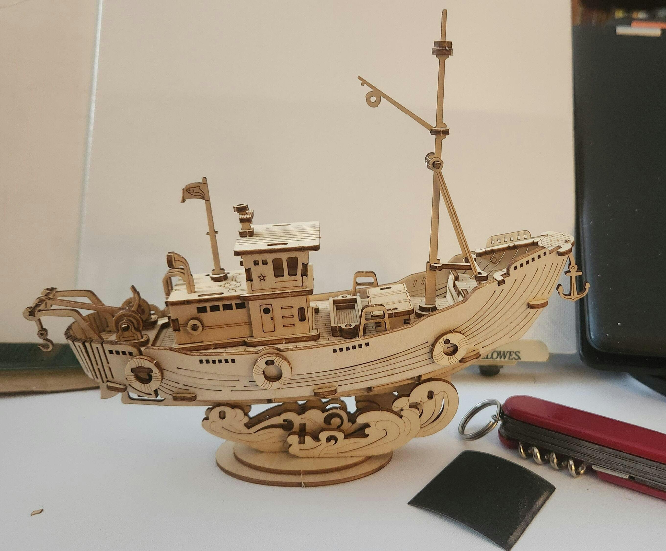 Immediately built the ship upon arrival. The pieces popped out with ease and most fit snugly. Only issues with loose pieces are with the ladder at the back of the cabin, a "bolt" near the propeller, and the ship itself doesn't fit too securely to the wave display/stand. You may want to glue it on to make sure it doesn't fall off accidentally and snap the wood (though the model does come with spare parts for the thinner/easily lost pieces).