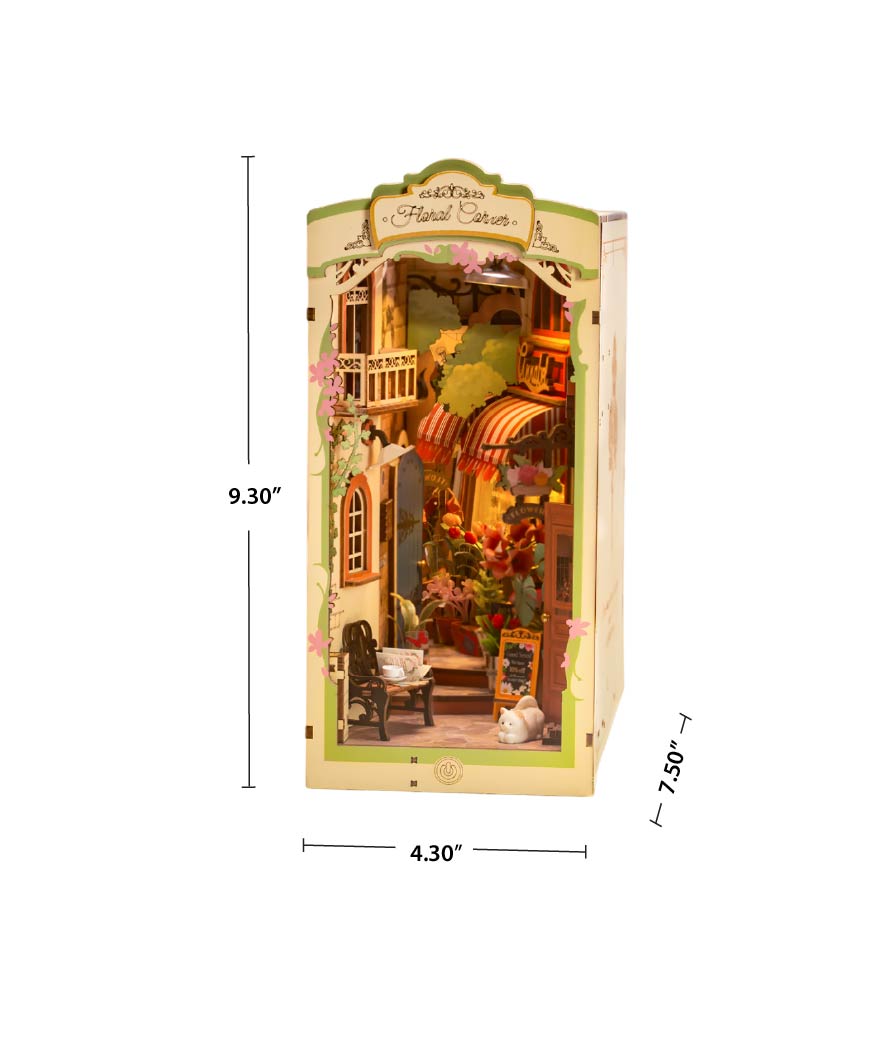This book nook kit features flower shops, each brimming with vibrant blooms, hanging baskets, and window displays bursting with color. Cobblestone paths and charming storefronts create an inviting atmosphere, perfect for adding a touch of nature's beauty to your bookshelf. With intricate details like shop signs, potted plants, and delicate floral arrangements, this kit captures the essence of a peaceful, hidden street where flowers are always in full bloom. Complete with soft lighting, it transforms your shelf into a serene escape.