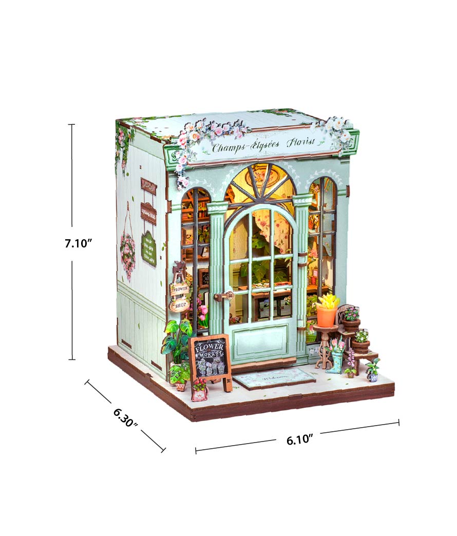 From the dainty floral arrangements to the hand-painted shop signs and warm, glowing interior, every detail evokes the feeling of strolling down the Champs-Élysées on a sunny afternoon. The soft LED lights cast a welcoming glow, highlighting rows of flowers ready to be wrapped for someone special.