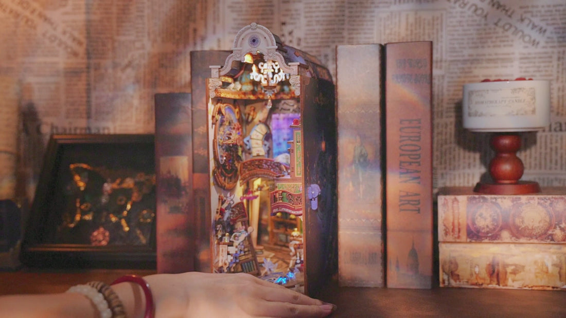 Venture into a realm where knowledge is power and magic lingers in the air with this captivating DIY book nook kit that brings a spellbinding scene to life-complete with soaring shelves, glowing lanterns, and a majestic white owl mid-flight, guiding the way through ancient tomes and arcane secrets.