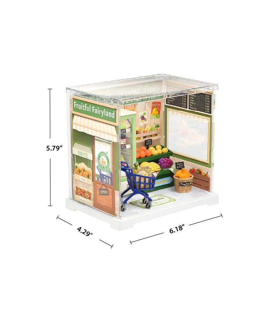 Bring the vibrant energy of a fresh market to life with this delightful DIY miniature kit, thoughtfully designed in a smaller scale than our original Super Creator series. Overflowing with colorful fruits, rustic crates, and charming market details, this miniature scene captures the joy of a sunny day spent browsing local produce. From crisp apples to juicy oranges and bunches of bananas, every detail is thoughtfully crafted to create a warm, cheerful atmosphere. A perfect project for crafters who love scenes full of life and color!